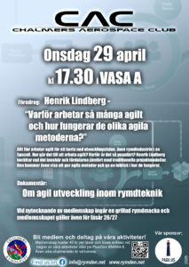 CAC welcomes you to a lecture on the current topic that more and more people are working Agile these days, especially in software development, but also in the space industry they are switching to agile methodology, the main example is perhaps SpaceX. BAE Systems Bofors also used the method to develop its new drone concept in just five months instead of several years. But how does it actually work agile and why is it so popular? At this lecture, Henrik Lindberg from Pagilus will explain what it means to work agile and what the advantages are compared to the more traditional project models. He will also show a couple of agile methods and give a brief insight into how they work. After the lecture, we will show a documentary about the application of agile methodology in the space industry. During the break, you can buy hot Space Sandwiches, snacks and drinks. During the evening we will also have a members’ meeting.