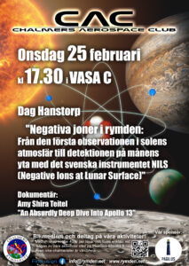 CAC welcomes you with à New date to the first lecture of the spring on Wednesday, February 25th in Vasa C when Dag Hanstorp will talk about negative ions in space and the Swedish instrument NILS (Negative Ions at the Lunar Surface) that is on the Chinese lunar lander Chang’e 6.